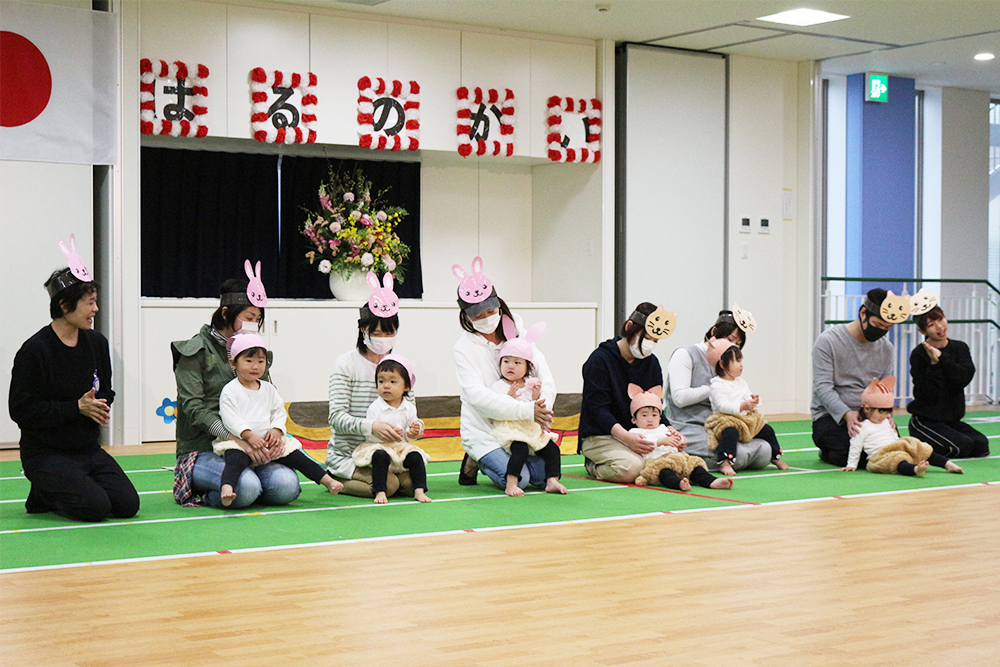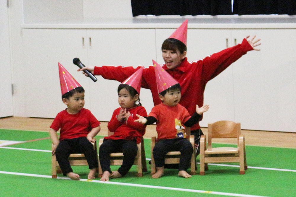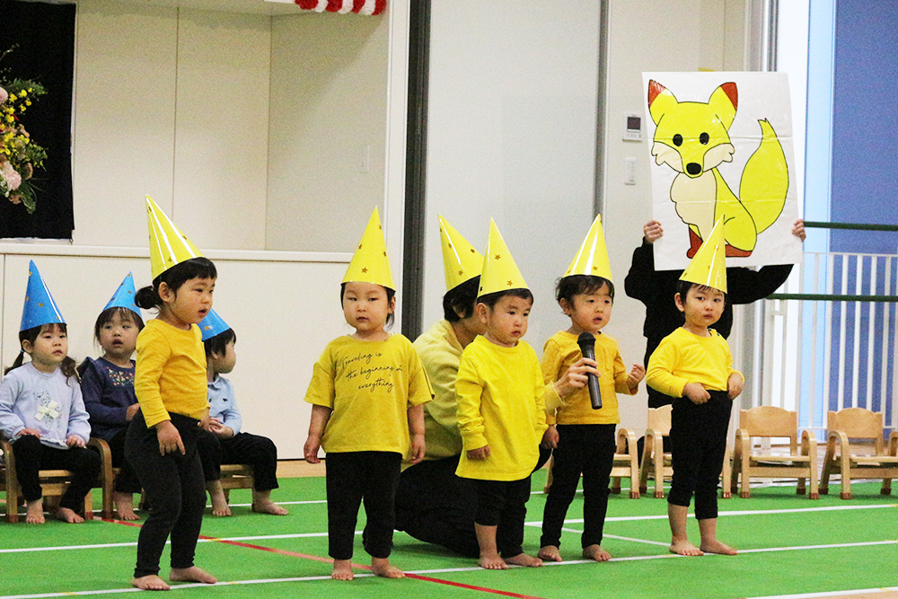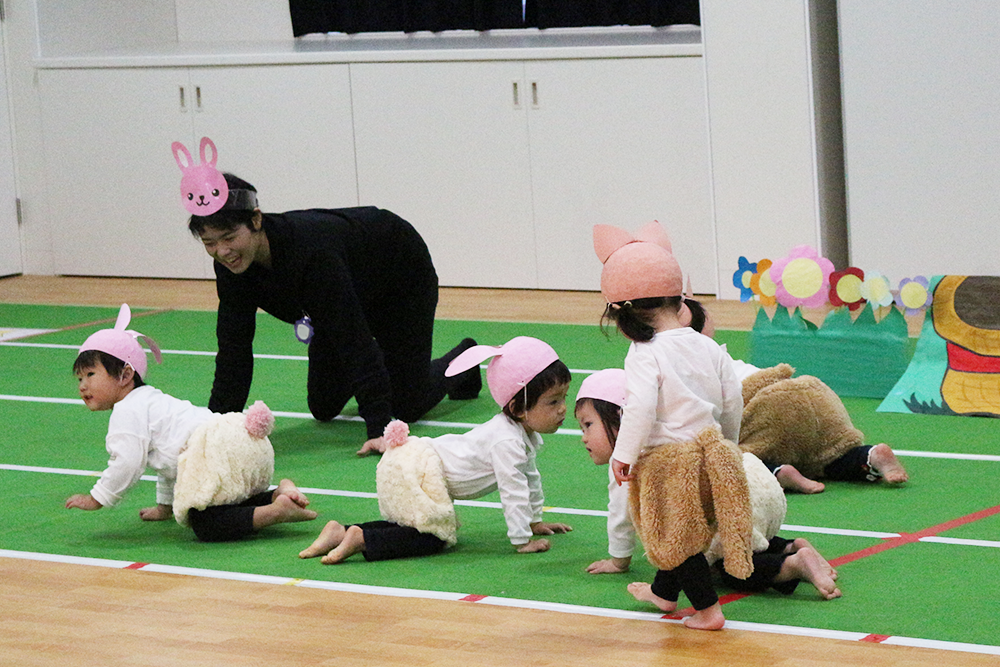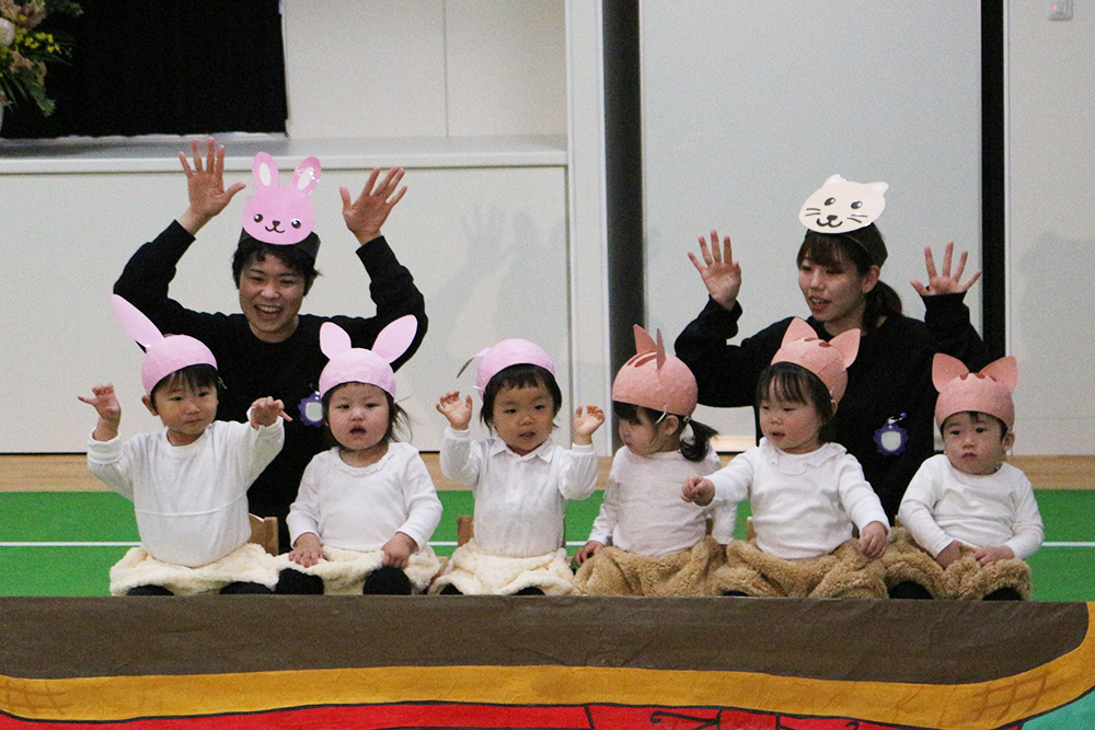 かわいい動物さんに扮して初めての発表会に挑戦です。元気なお返事と山登りやジャンプを披露してくれました。最後はお父さんお母さんと楽しくうたを歌いました!